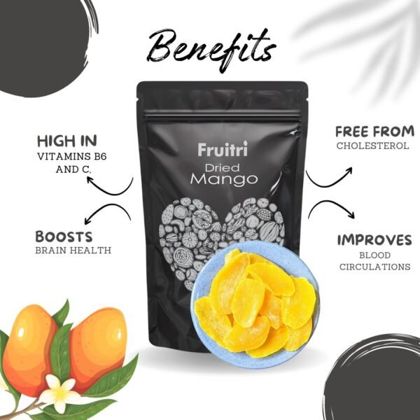 - Dried mango, being a good source of B-complex helps boost energy and reduce stress. The fiber in it improves digestion and overall heart health. Other health benefits offered by these dried fruits include a better skin appearance, increased circulation, and weight loss.